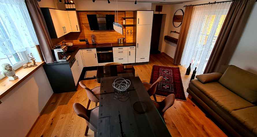 Die große Wohnküche mit modernsten Geräten, kostenlosen und ständig gekühltem und gefiltertem Leitungs- bzw. Sodawasser sowie ein Kaffee Vollautomat lassen keinen Wunsch offen.